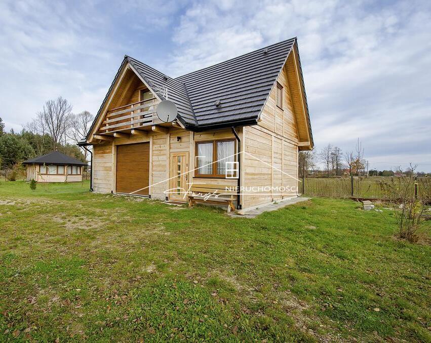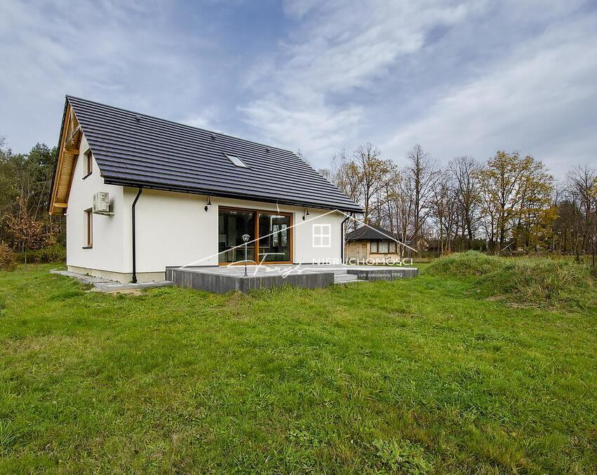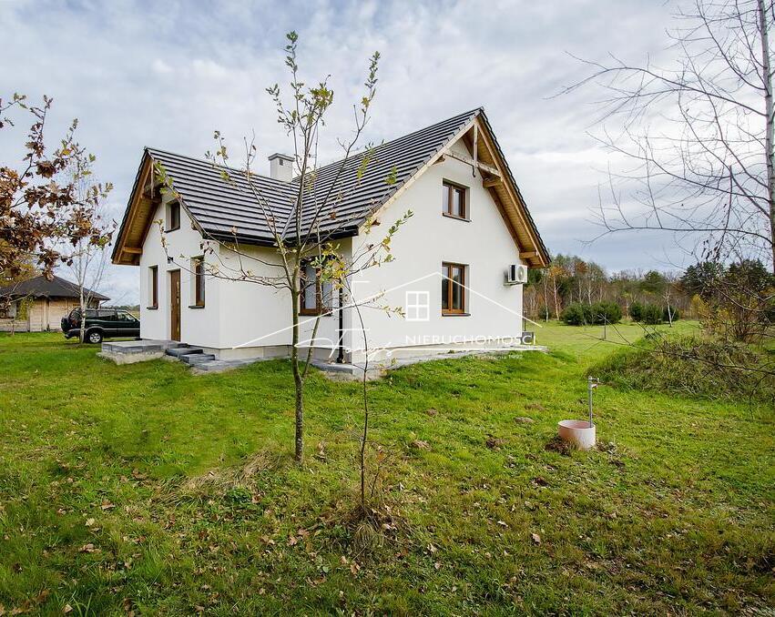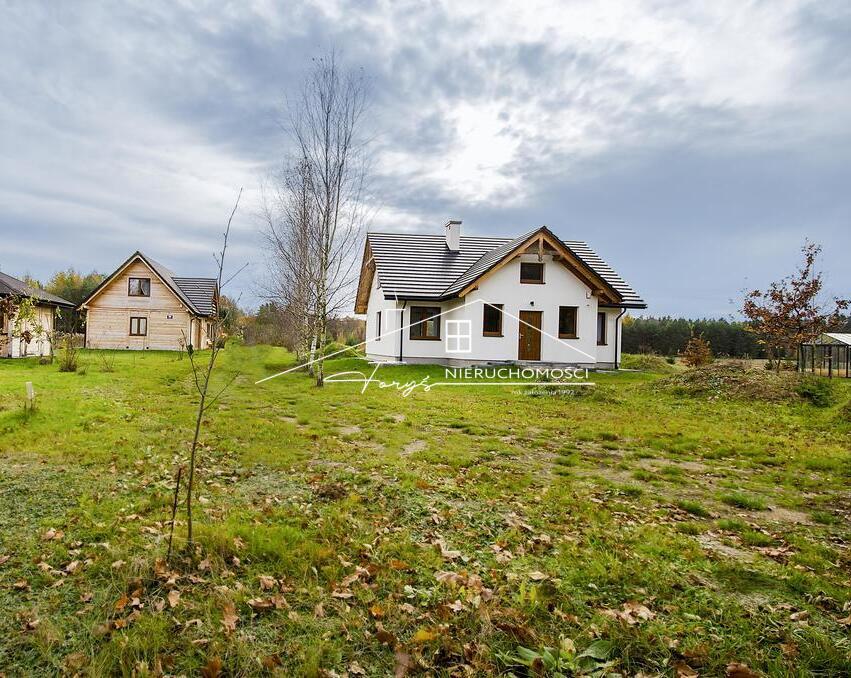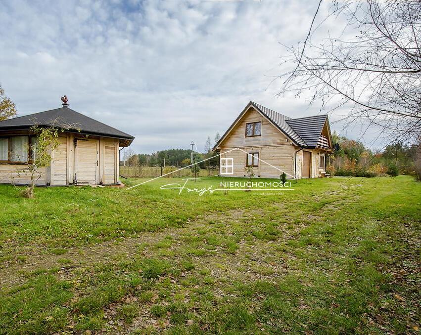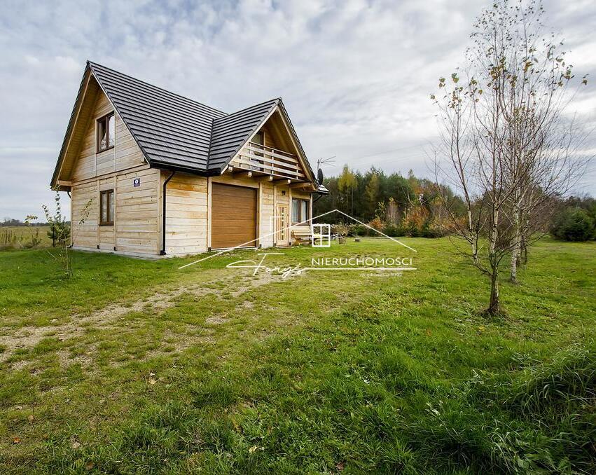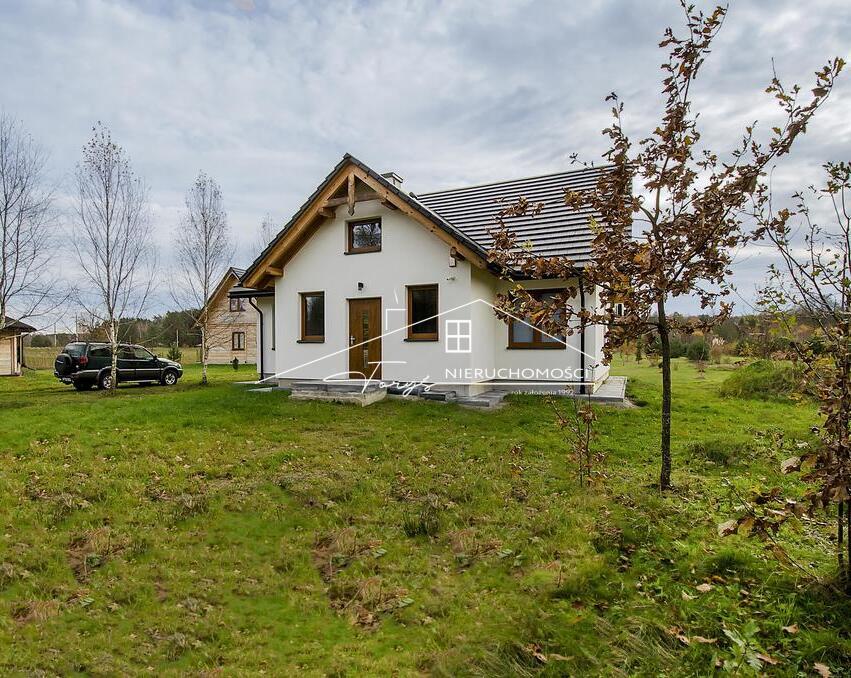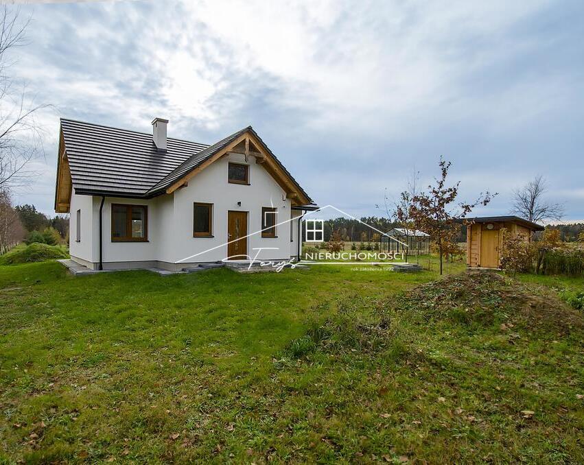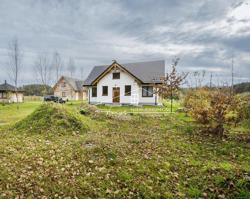 Budynek parterowy o pow. 77 m2 konstrukcji drewnianej z brusa 30 cm wybudowany w 2021 r ocieplony grafitowym styropianem o gr. 15 cm, Posadowiony na płycie fundamentowej, pokryty ceramiczną dachówką. W całym domu zainstalowano elektryczne ogrzewanie podłogowe, które gwarantuje przyjemny komfort cieplny. Ponadto, w pokoju dzienny znajduje się klimatycznych kominek i klimatyzator ROTEUS. Na całą powierzchnię domu składa się: przestronny pokój dzienny z drzwiami panoramicznymi na taras z którego można podziwiać lokalną przyrodę, sypialni, w pełni wyposażonej kuchni, łazienki i przedpokoju. Stolarka okienna i drzwiowa marki Rota,