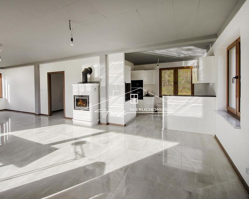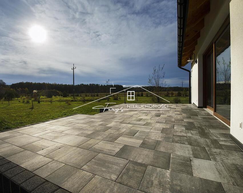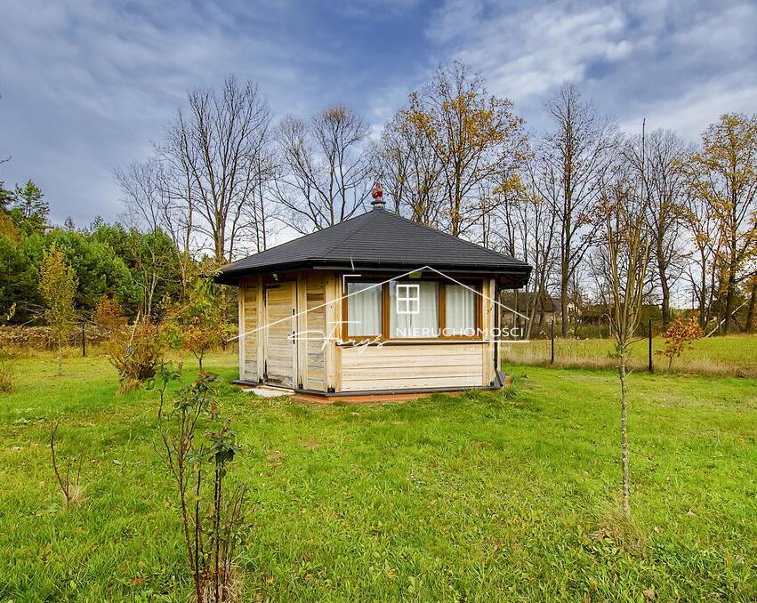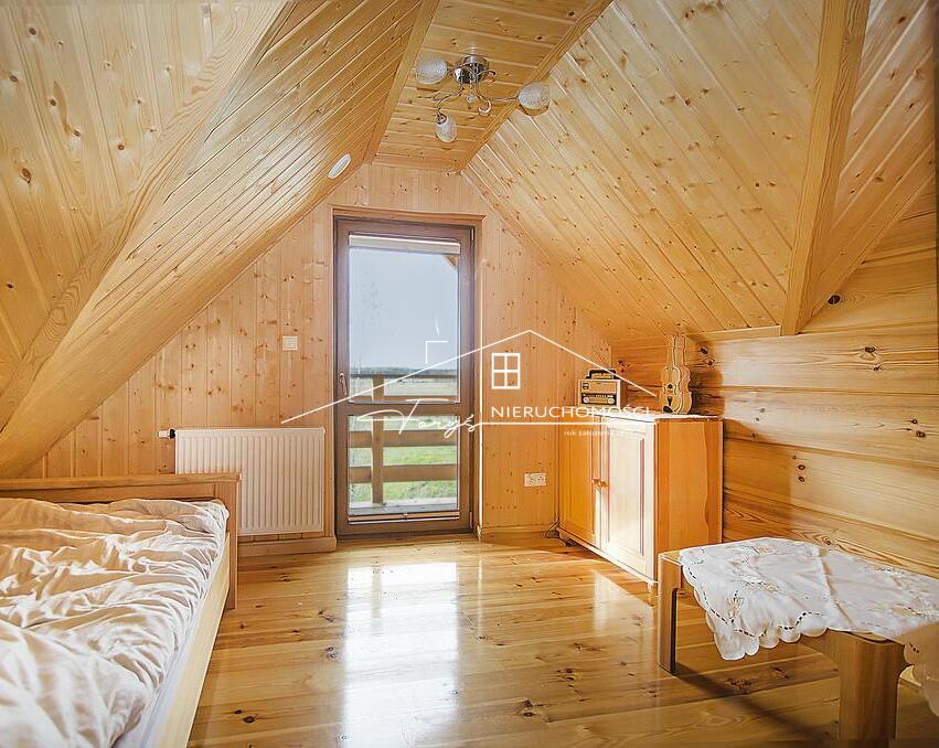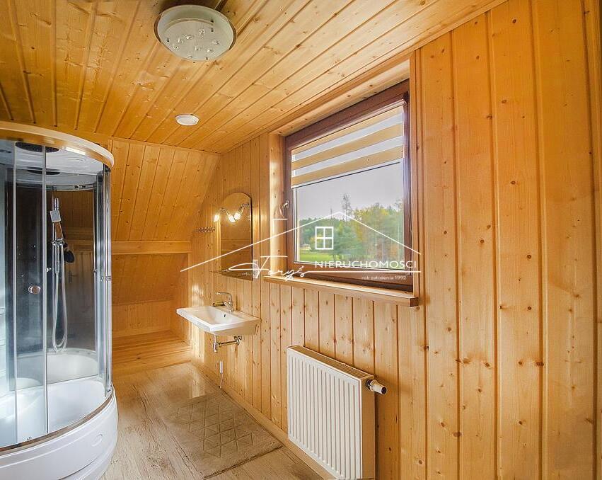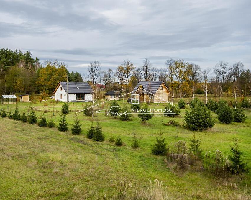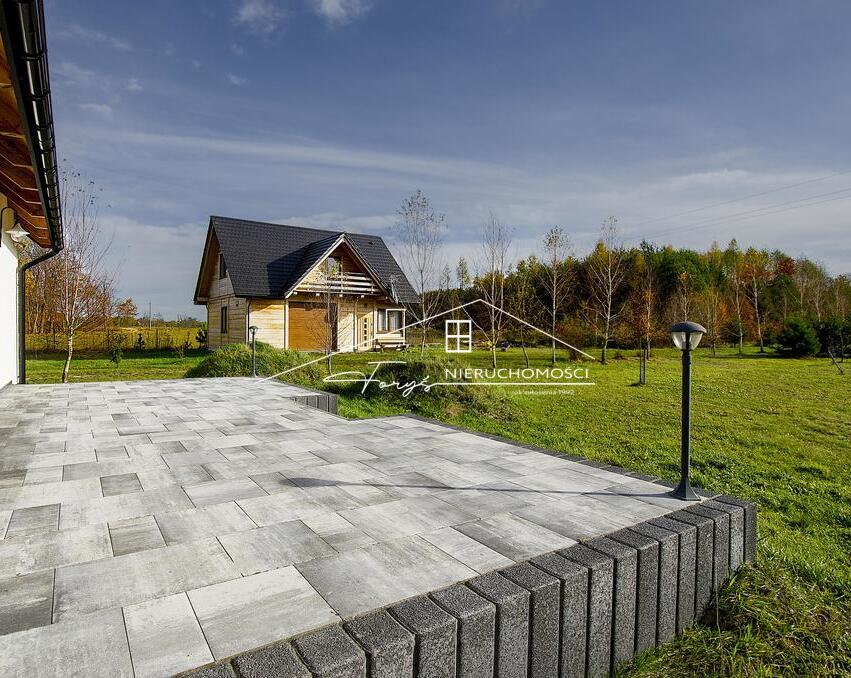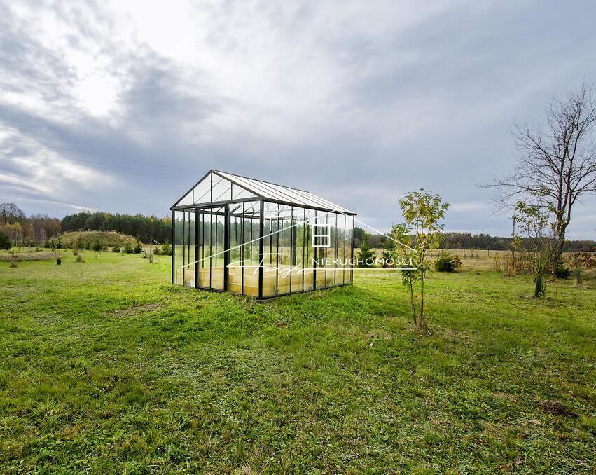 Budynek parterowy o pow. 77 m2 konstrukcji drewnianej z brusa 30 cm wybudowany w 2021 r ocieplony grafitowym styropianem o gr. 15 cm, Posadowiony na płycie fundamentowej, pokryty ceramiczną dachówką. W całym domu zainstalowano elektryczne ogrzewanie podłogowe, które gwarantuje przyjemny komfort cieplny. Ponadto, w pokoju dzienny znajduje się klimatycznych kominek i klimatyzator ROTEUS. Na całą powierzchnię domu składa się: przestronny pokój dzienny z drzwiami panoramicznymi na taras z którego można podziwiać lokalną przyrodę, sypialni, w pełni wyposażonej kuchni, łazienki i przedpokoju. Stolarka okienna i drzwiowa marki Rota,