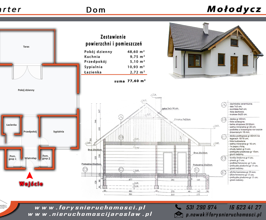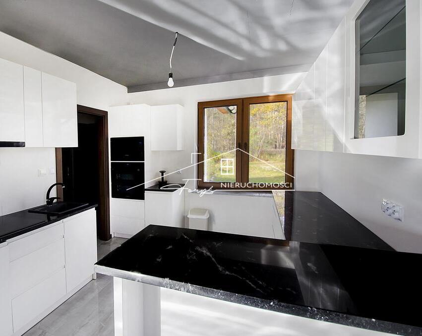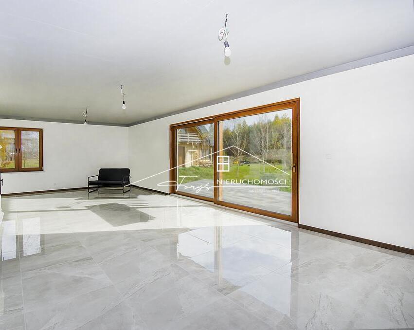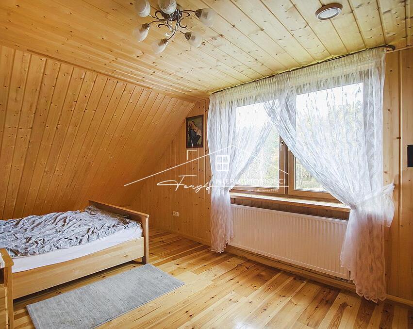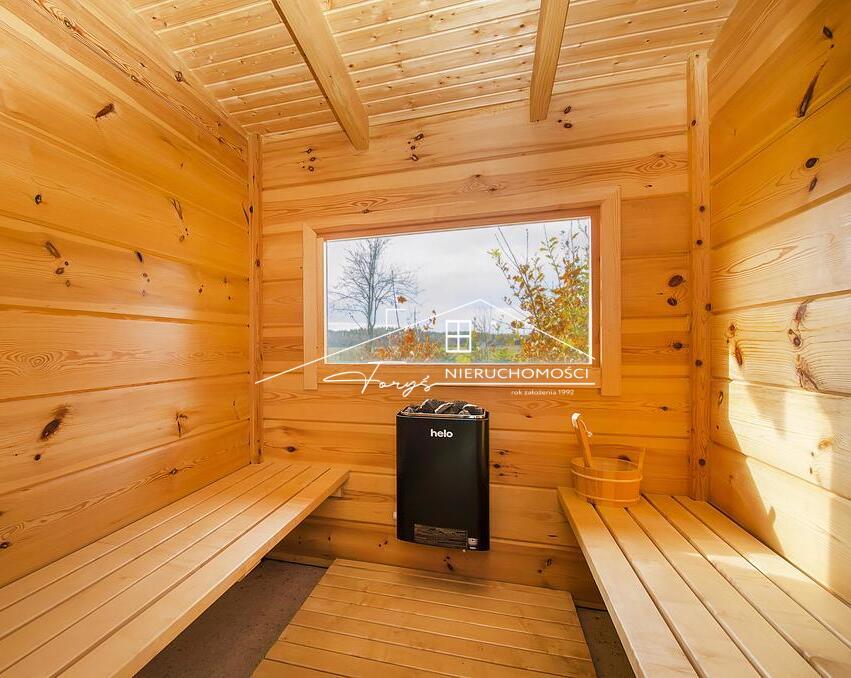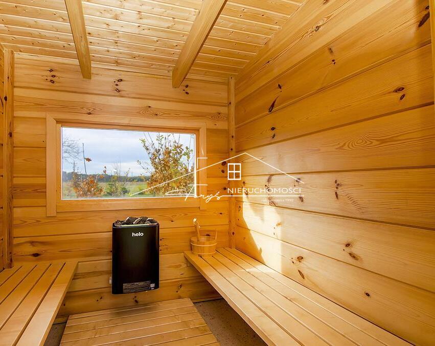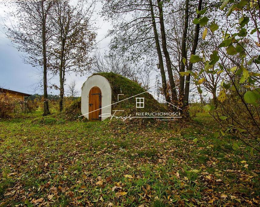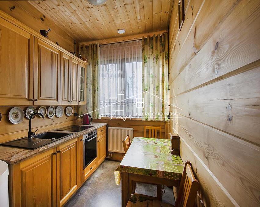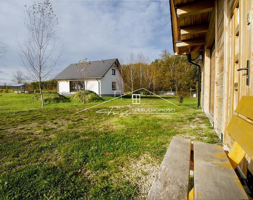 Budynek parterowy o pow. 77 m2 konstrukcji drewnianej z brusa 30 cm wybudowany w 2021 r ocieplony grafitowym styropianem o gr. 15 cm, Posadowiony na płycie fundamentowej, pokryty ceramiczną dachówką. W całym domu zainstalowano elektryczne ogrzewanie podłogowe, które gwarantuje przyjemny komfort cieplny. Ponadto, w pokoju dzienny znajduje się klimatycznych kominek i klimatyzator ROTEUS. Na całą powierzchnię domu składa się: przestronny pokój dzienny z drzwiami panoramicznymi na taras z którego można podziwiać lokalną przyrodę, sypialni, w pełni wyposażonej kuchni, łazienki i przedpokoju. Stolarka okienna i drzwiowa marki Rota,